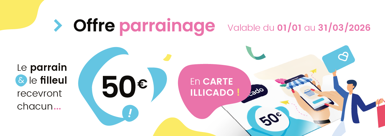 Grâce à cette offre, chaque parrainage réussi vous permet de bénéficier d’une carte illicado d’une valeur de 50€, et votre filleul en reçoit également une du même montant.