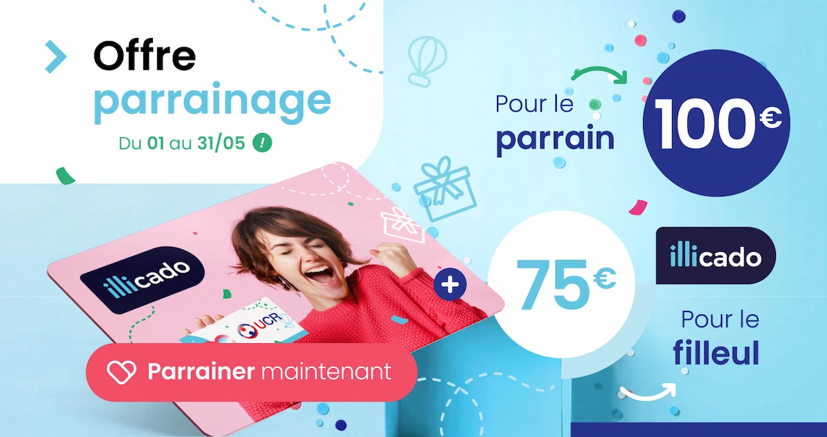 En mai, nous doublons vos gains en cas de parrainage ! Vous recevez 100 € en carte illicado, contre 50 € habituellement. Ne laissez pas passer cette occasion unique.
